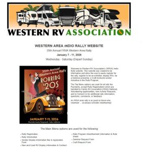 « All Events This event has passed. 2026 Western Area Rally January 7 - January 11 « SILVER SPUR RV, SILVERTON, OR Bend Sisters Garden RV Resort » Please contact FMCA/FRVA for registration. Add to calendar Google Calendar iCalendar Outlook 365 Outlook Live Details Start: January 7 End: January 11